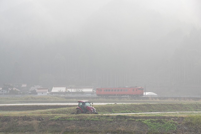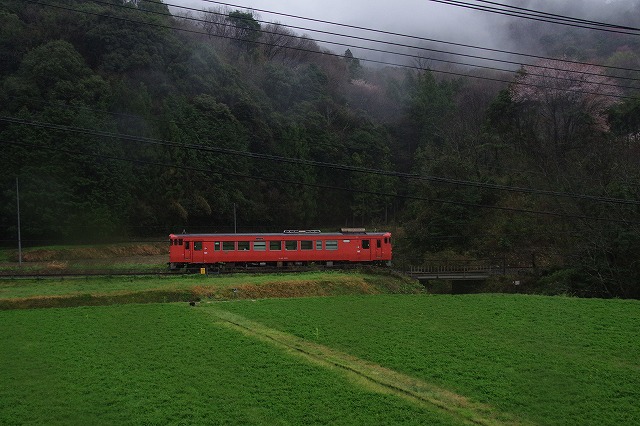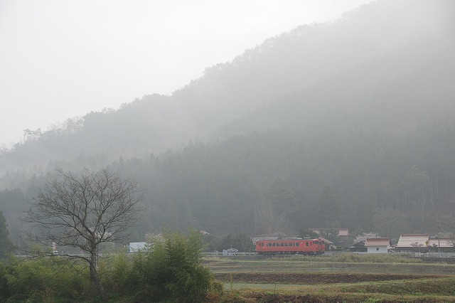 一夜明けでもまだ嵐の余韻が残り、なかなか行動開始できない。リミットの10時過ぎに仁保へ向かった。雨は止まず露出も上がらないので、駅進入を陸橋から狙う。昨日同様安全に追っかけを行い、長門峡鉄橋と徳佐の陸橋で追いつく。 |