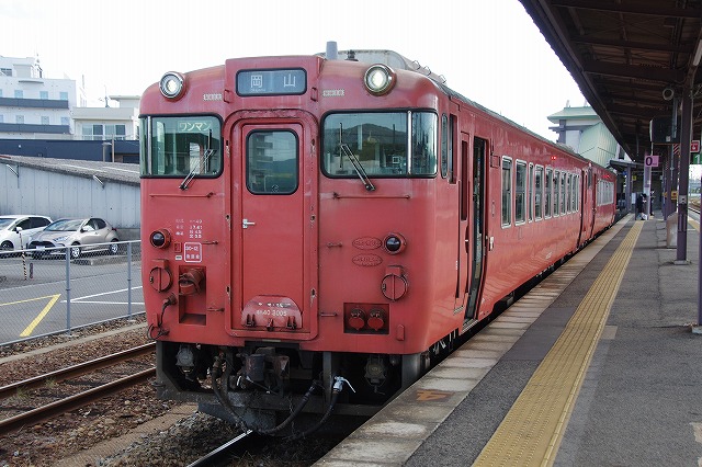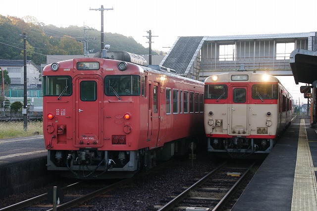 | 5時起床、福渡駅バルブからスタート。国鉄色の単行が回送で3番に到着し、折返し始発の津山行になった。明るくなってきたので車で近くの鉄橋へ行き数本撮影、合間にサンドウィッチで朝メシ。全て一般色キハ2連だった。再び福渡駅に戻り、交換シーンを撮影。上りは一般色キハ4連、下りは急行色2連と良い組合せだった。レンタカーを返す時間が迫りつつあるので、倉敷へ戻りだす。 |