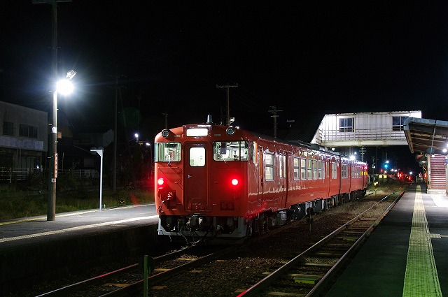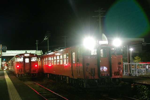 Timesカーシェアリングで今晩の宿を手配し、チェックイン?する。倉敷市街地の渋滞が激しく、抜けるのに手間取り、19時過ぎに津山線野々口駅着。丁度下りのキハ120が到着。一駅ずつロケハンしながら今宵の撮影計画を立てる。交換の有無とバルブのしやすさで福渡駅に決定。撮影の合間に車内でコンビニ弁当で夕メシ。店が全然開いていないので仕方ない。23時までの間に一般色から国鉄色・急行色とフルコンプ、満足して車中泊した。 |