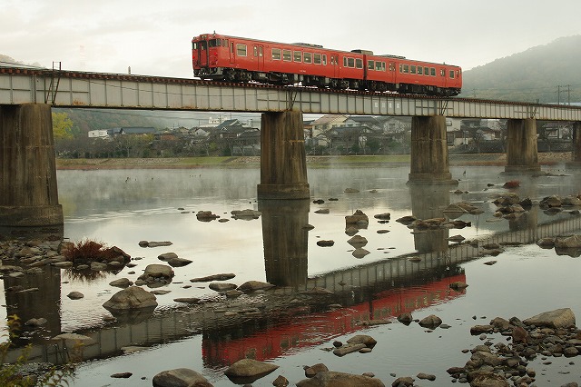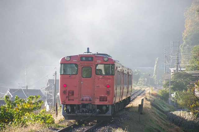 福渡を出ると朝霧が激しく、真っ白けっけの中を走る。金川〜建部で霧が止んだので、ここで上下鈍行を待つ。下りはキハ120単行、上りは一般色キハ3連だった。渋滞にあわずに9時前にレンタカーを返却し、倉敷駅へ。駅撮りを少しして9:36発、豪渓へ向かう。鈍行車内でBと合流、だんだん明日の仲間が増え出す。豪渓9:52着。線路沿いを新見方へ歩く、コンビニの手前で上り国鉄色やくもから伯備線の撮影スタート。 |