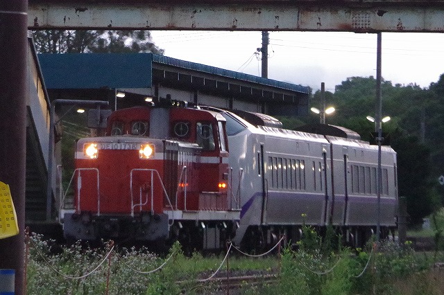 | 早朝5時、まだ列車が来ない時刻なのに駅の接近放送が聞こえて、飛び起きる。カメラを構えて待つとDE10が特急車両を牽いて登場!函館への配給列車のようだ。朝からツイている。今日が北海道最終日、出発まで函館本線のキハ40撮影だ。一昨日撮れなかった駒ヶ岳との絡みを期待。 |