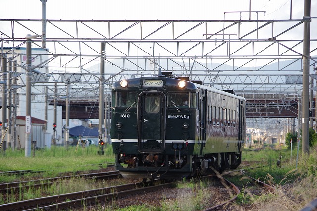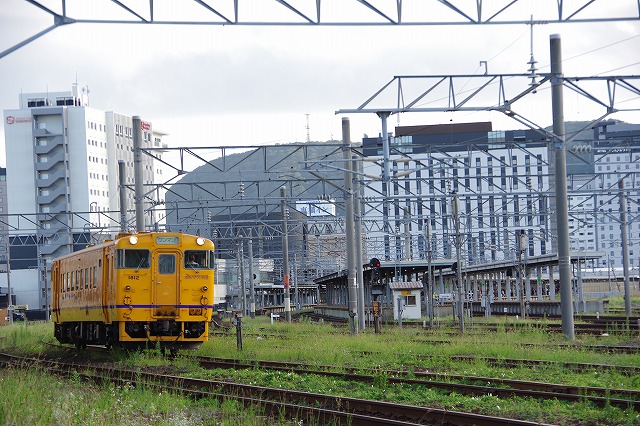 晴れてきたので大沼駅に行き、駒ヶ岳との絡みを狙う。キハ40単行の時だけタイミング悪く頂上に雲がかかる。もう一本粘る。下り2連のタイミングでバッチリ頂上まで出た。大満足で大沼を後にして函館へ。 |