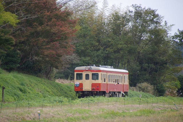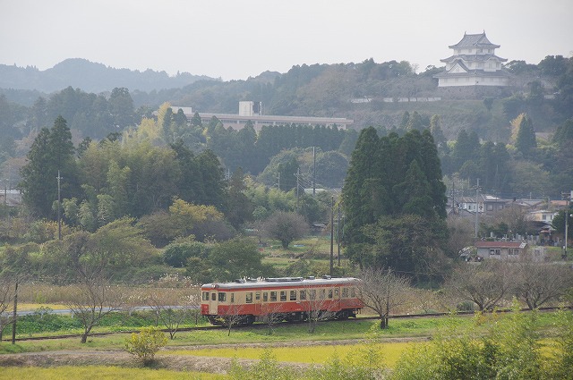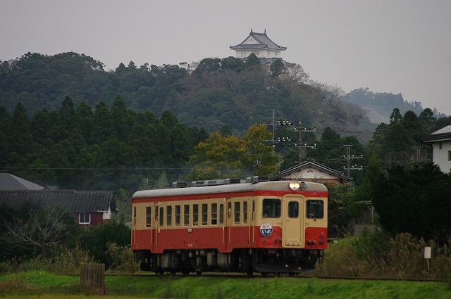 キハ28の故障に伴い、単行運転しているいすみ鉄道のキハ52。キハ28に掲出予定だったJR四国所有の本物ヘッドマークをキハ52に掲出中ということで、キハ52-125は11年ぶり、いすみ鉄道では初めての撮影に向かった。最初は城見ケ丘付近の川に架かる橋から大多喜城を絡めて撮る。急行いよのヘッドマークは大多喜方にあるようで見ることは出来なかった。国吉駅先の後ろ打ちでやっと急行いよのヘッドマークをカメラにおさめる。