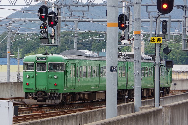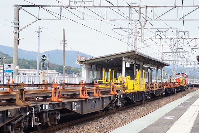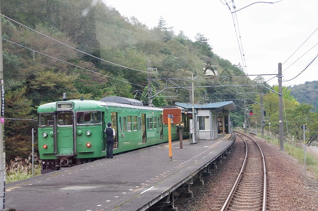 待避で追い越してもう一発やるため、即撤収し駅へと急ぐ。後続の列車に乗り、おごと温泉で追い越す。候補地だった北小松ホーム先端は先客がいたのでパスし、次の近江高島で下車。手前の高台から撮れそうなので小走り10分で現着するが、バックの高圧線と手前の架線柱のスパンがイマイチで断念。小走りで駅へ戻りホーム先端へ。息が整った頃にロンチキが通過して行った。