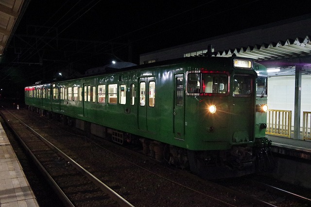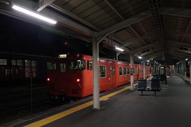 宮津経由西舞鶴まで乗車し折り返す。宮津で5分停車、この駅にもまたまた113系がいた。調べると相互乗入車両の精算のために、1日2往復走っているらしい。この113系は快速大江8号として福知山へ向かう。陽が暮れた天橋立に到着、ここで鉄印を入手。駅から5分のところにある小田寿司で地魚の寿司で夕メシにした。天橋立から残りの豊岡まで向かう、真っ暗だったが昔訪れた加悦鉄道の分岐駅は雰囲気で分かった。駅名は丹後山田から与謝野に変わっていた。豊岡で京都丹後鉄道を乗り終え、今日の宿のある香住へ。豊岡もまだまだ国鉄型の宝庫、広い構内にはタラコ色がゴロゴロ。香住へ向かう鈍行もキハ47-1133だった。