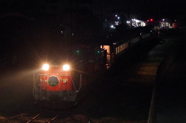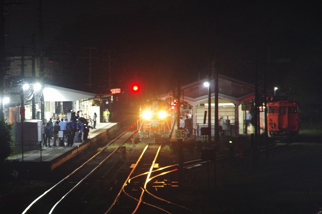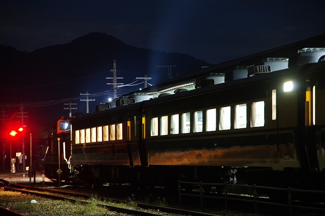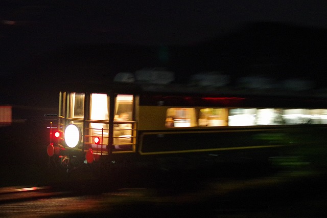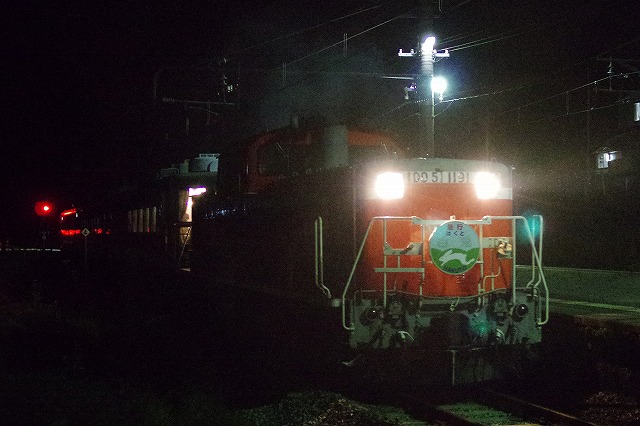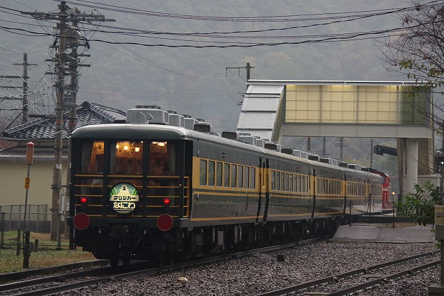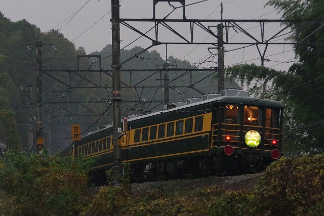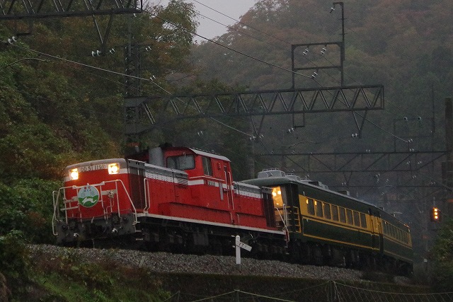 | 日本旅行の主催で、団体臨時列車「サロンカー白兎」が運転された。往路は大阪発が15時台で鳥取には22時過ぎ着のため、明るい時間帯は三田辺りまでで混雑が予想できた。混雑回避のため、日没直後の古市付近をスタート地点にして、昼前からノンビリ待った。通過時に2名追加、雨で露出は厳しかったが、晩秋の雰囲気の中マッタリ撮影できた。以降、長時間停車を上手く使って追い越し、浜坂まで夜間撮影した。 |