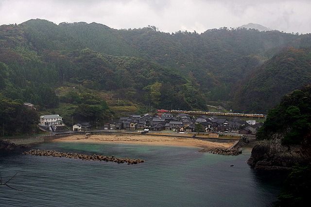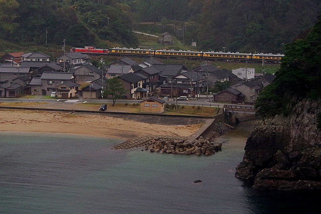 | 復路は昨日ほどでは無いが、鳥取13時頃発とスロースタートで停車も少ないため、福知山辺りまでで2発と見積もった。先ずはDE15ラッセル回送を撮った濱須井の俯瞰をメインに計画を立てた。この撮影地は佐津の先にあるため、佐津の停車で抜ける事が分かったので、佐津駅進入をスタートにした。通過まで時間があるので、午前中は佐津付近でキハ40や特急はまかぜを撮影した。午前中はまずまずの天気だったが、昼を過ぎると曇ってきた。サロンカー白兎通過時にはパラパラ降り出してきた。メインの濱須井の俯瞰ポイントに着くと、横殴りの雨でずぶ濡れになって撮影した。 |