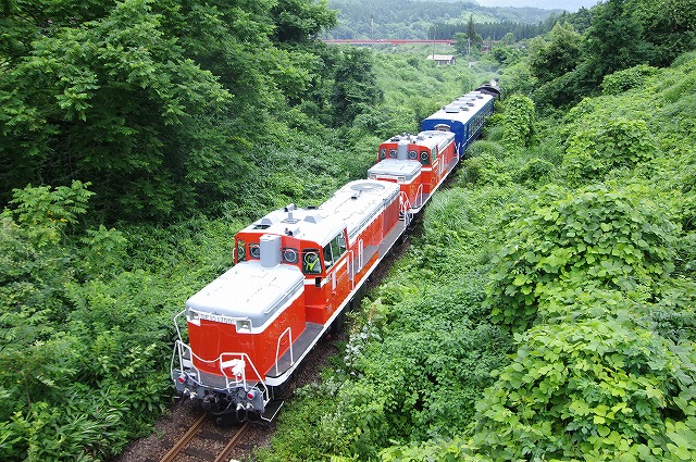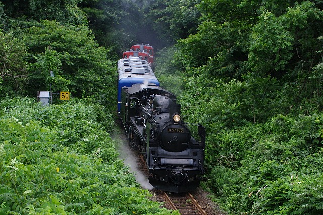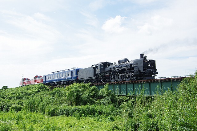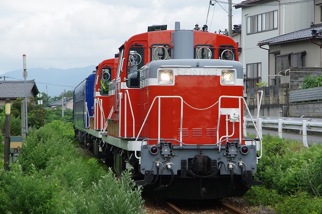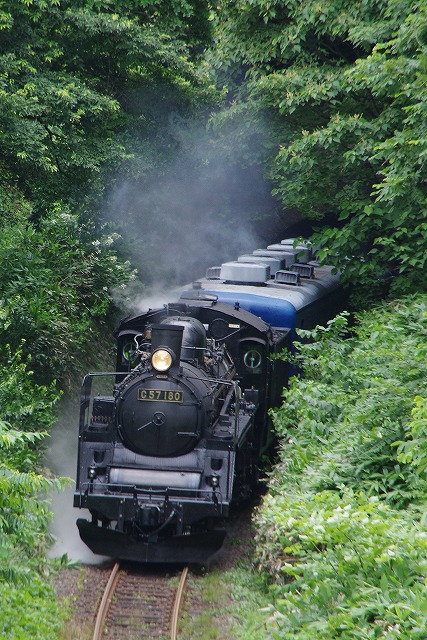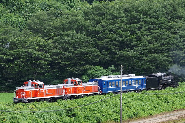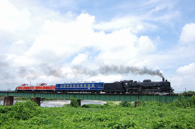 磐越西線C57試運転2日目の13日はDE10が2両ぶら下がるという情報を得て、翌14日の東武DE10(DL大樹)会津若松試運転とセットにして出掛けた。12日深夜に家を出発。早朝の只見線朝練を経て、五泉の早出川鉄橋には8時半着。着いたときは雨だったが、天気は徐々に回復し青空も少し見えてきた。汽笛を鳴らしながらC57が通過、追っかけ開始だ。東下条駅付近は草の背が高いため、高速の側道まで上がって見下ろす感じで撮った。往路のラストは、以前撮った事がある三川のトンネル先で待つ。ここは左へ巻いているので、後ろのDE10を隠し、まるで12系客車列車を牽いている感じで撮れた。試運転折返駅の津川駅まで行き、駅でのスナップ写真を撮った。