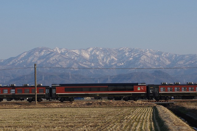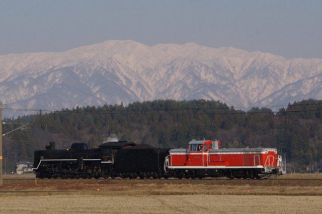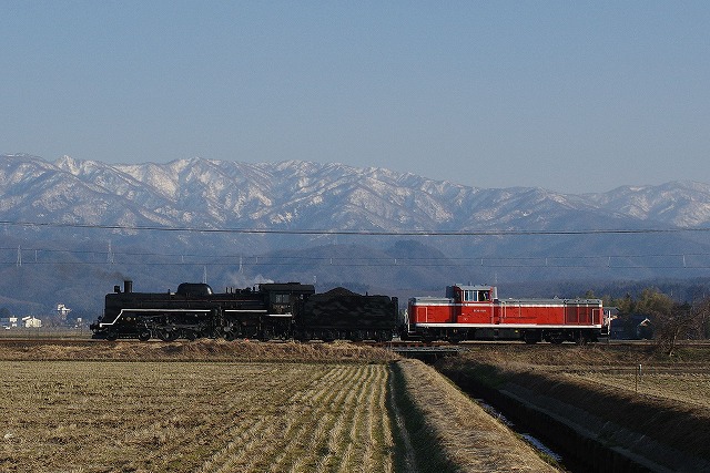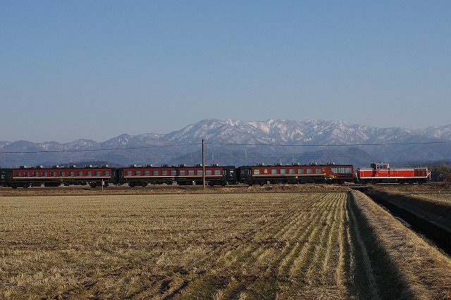 復路は岩船町〜村上から。待つ間に近くのローカルスーパーで買ったお弁当で昼メシにする。ここも高速寄りには、折返しのDE+客車の編成写真を狙う人たちでひな壇ができていた。私はDE10の牽くSL回送をメインに追う。岩船町の長時間停車で一気に先回りして3発。ラストの中浦付近は飯豊連峰と五頭連峰などの風景を贅沢に独り占めした。