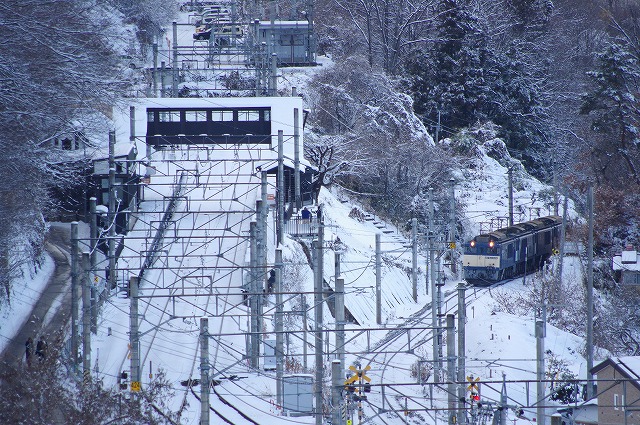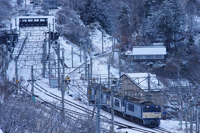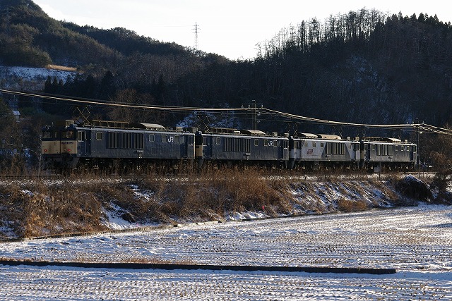 | 2021年の撮り初めは念願のEF64四重連回送。今まで行けずに初めての参加、雪景色の姨捨からスタートした。聖高原の高速下には見事なひな壇ができていたが、極力密でないポイントを選んで撮影して回った。 |
