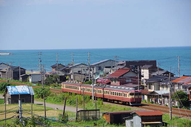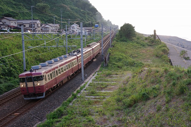 谷浜撮影後、糸魚川へR8で移動。順調に流れていたので、姫川で追い着き、おまけの一発。午後は青海の海とクモハ413を絡める。急行4号は、やりたいと思っていた昔の旧客と同じポイントで撮影。早川の鉄橋まで追っかけクモハ413三昧の一日が終了。ちなみに、翌17日は佐渡(イラスト付)マークで大当たりでした。 |