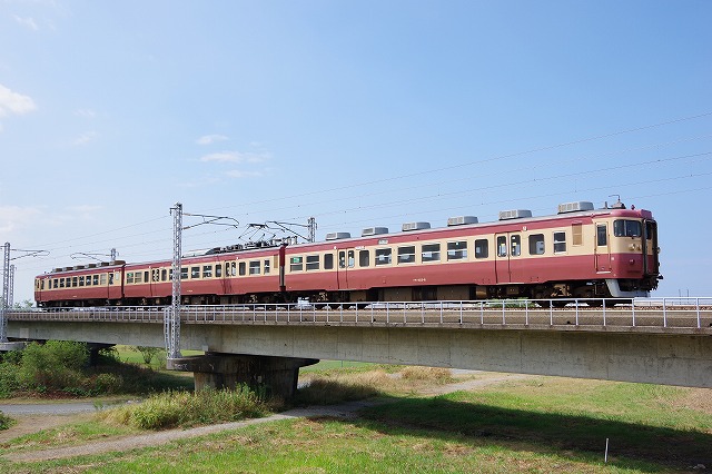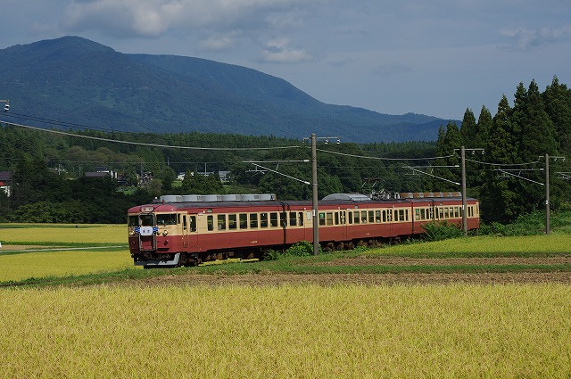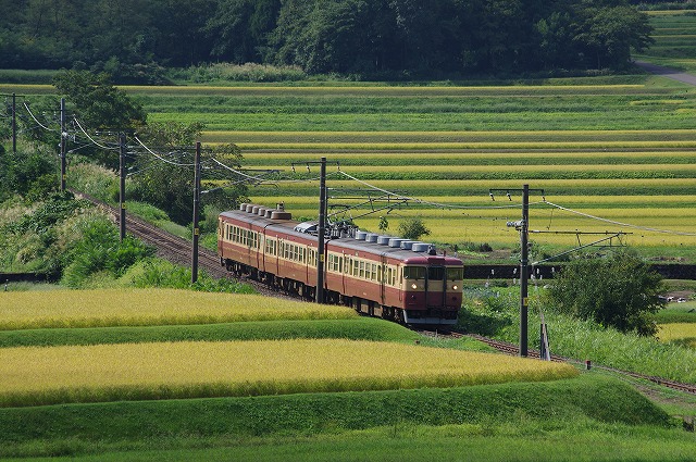| 色づき始めた稲穂とクハ455を絡めようと気合を入れて出発したが、貸切(個人名)ヘッドマークだったのでクハ455側を撮る気がなくなり、いつもはヘッドマーク狙いでオマケ撮影になっているクモハ413側を集中的に撮影することにした。 |