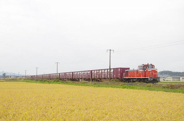 八戸貨物駅で今日のカマを確認すべく待っていると待望のDD16 303がコキを牽いて入換て来た!2009年1月以来の再会だ。心配していた「鉄道の日」のHM取付無しも確認。長苗代駅付近から撮影をスタートした。