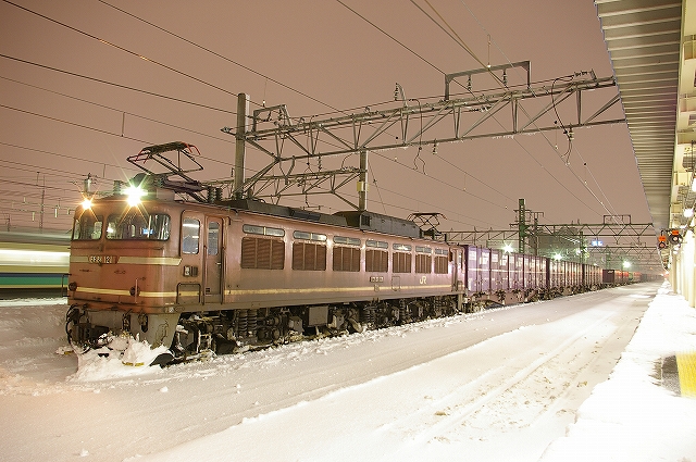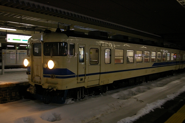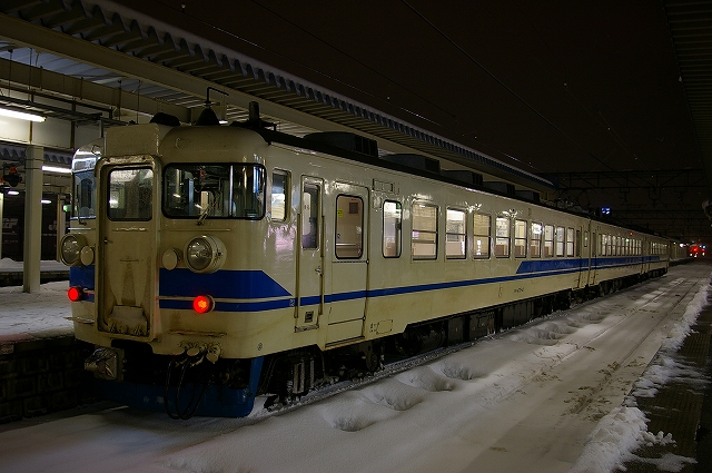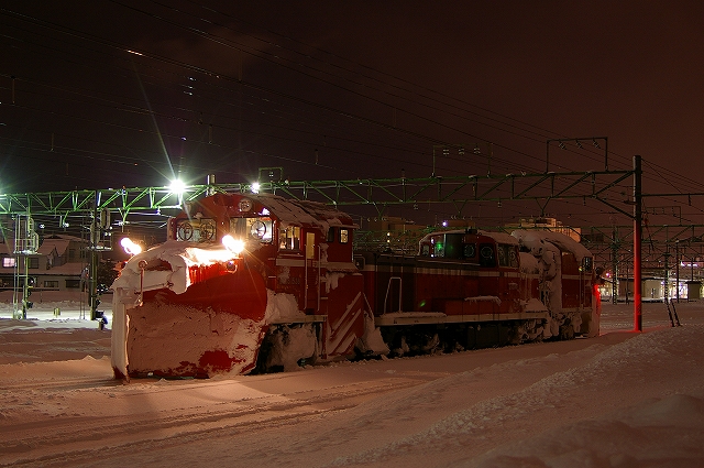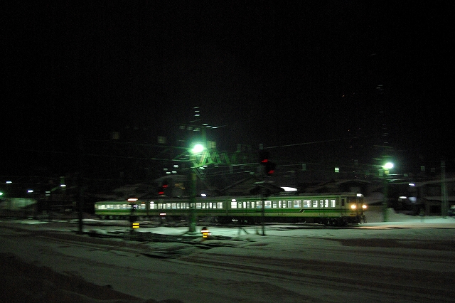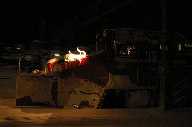 日本海側に大雪警報が発令されている5日晩、夕メシ後に家を出た。橋本駅で友人を拾い中央高速を北へ。情報収集しながら目的地を絞る。白馬から先は大雪で、上信越道も黒姫より先は通行止めとのことで、これじゃあ到達まで危うく、ラッセルの運転が確実な高山本線へ行こうか迷ったが、結局豊科で降りて国道147号を行く。白馬まではスキー渋滞でノロノロ運転だ。白馬から先は吹雪でさらにノロノロ運転。セブンイレブンで買い物休憩をとった以外はノンストップで走り、雪に埋もれる大糸線根知駅に3時半着、同業者なし。雪レ運転ならば15分以内に来るはずだが・・・。4時頃に駅照明が点灯し来るのか!と期待が高まるが、4時半になっても動きなし。待っている間に道路の除雪車がやって来て、慌てて車を移動させようとしたら鍵を雪の中に投げてしまい探すのにひと苦労、汗だくになってしまった。結局スカられたようで、情報収集に糸魚川駅へ。こちらで仙台からのM氏と情報交換。DD16は一旦庫から出たが入ってしまった様子。どうやら強風で運転見合わせのようだ。