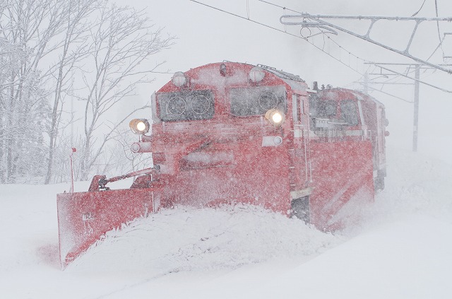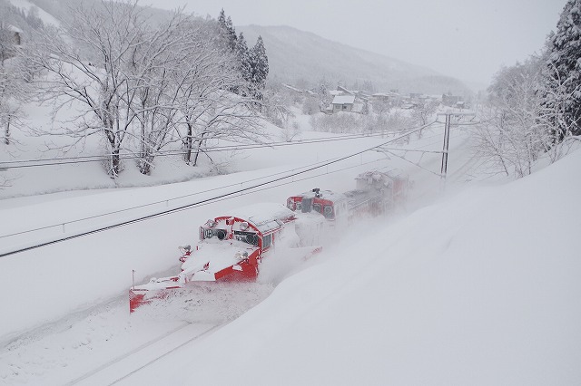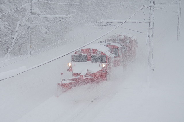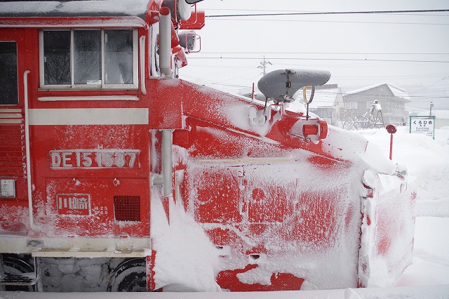 新井を過ぎると雪が強く降りだし、姫川原のカーブもかなりの降りだった。その先は吹雪で待っているのも辛く、長玉では真っ白になってしまうくらいだった。黒姫〜妙高高原の高速下では、しなの鉄道115系3連の、下り試運転の直後にラッセルがきた。さらに黒姫駅まで追っかけて、停車を撮った。美味しそうな駅そばの汁の匂いに、うしろ髪をひかれつつ折返しポイントへ。 |