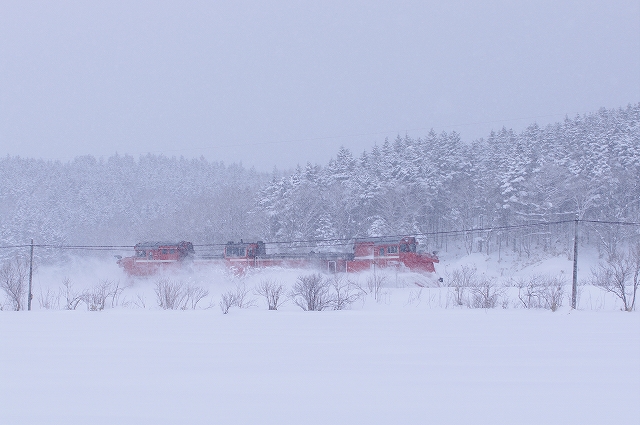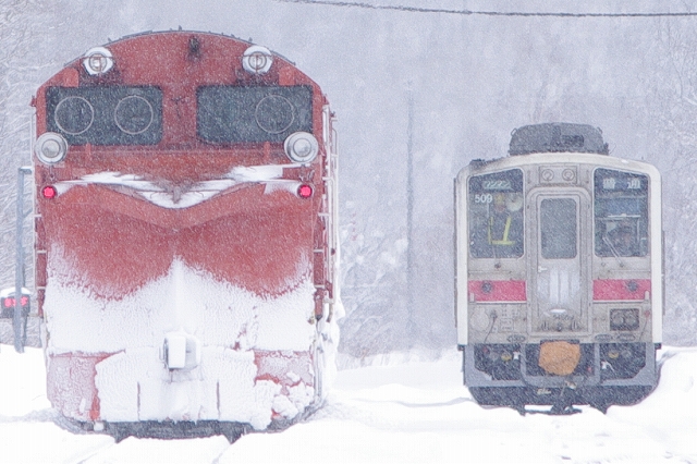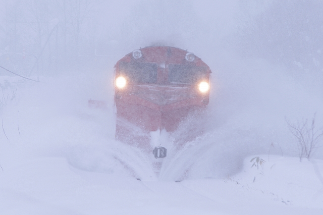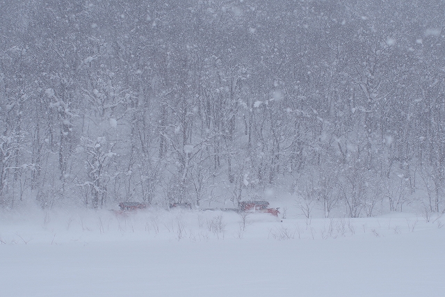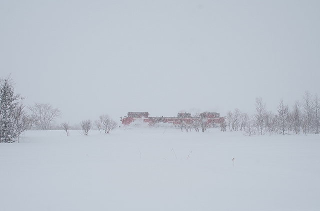 幌延までは追っかけが厳しそうだ。抜海を出てすぐに雪が降りだして、時折吹雪き撮影と追っかけに厳しい状態が続く。南幌延駅で撮影していると一旦駅に停まって発車していった。毎度の追い付きポイント雄信内〜安牛のカーブでは、前回同様片側のみウィングを出して通過、ここの踏切の決まりなのだろうか。