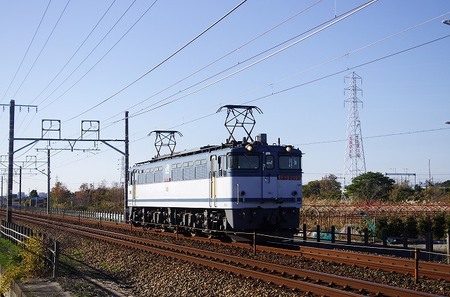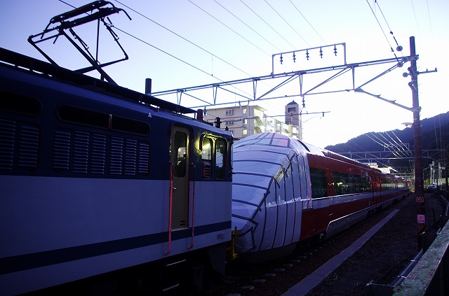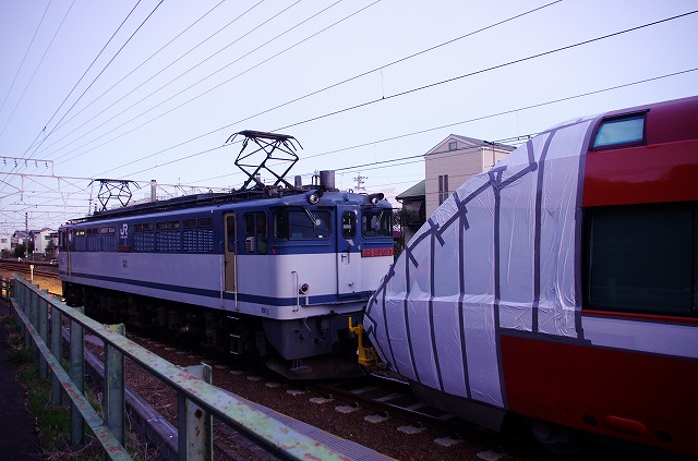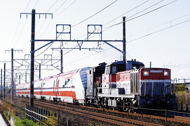 小田急の新型ロマンスカーGSEが、豊川の日車から甲種回送された。子連れのため有名どころを避けて西浜松前後で撮影した。愛知県民の森のバンガローに前泊して、午前中は本長篠辺りで紅葉と飯田線のプチ撮影後に舞阪へ。ここはMSE甲種の時撮影し、空いているのは確認済みだ。ネットで情報収集すると、日車工場や浜名湖付近は相当の人出のようで、昨年のEXEαとの差は歴然だ。GSE甲種通過時にもう一人地元の方が来て、まったり撮影。 西浜松でヨ8632を切り離し、PF2079へ機関車交換している間に豊田町へ向かう。ここも他1名だった。今日の遅いスジは用宗で待避があるのでバルブ狙いで高速に乗る。